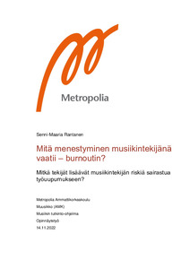 Käyn opinnäytetyössäni läpi musiikintekijän työnkuvaa ja alalla vallitsevaa työkulttuuria pohtien työuupumukseen mahdollisesti johtavia syitä musiikintekijän ansaitsemismallin, alalle pääsyn vaatimusten, luovuuden, roolimallien ja portinvartioiden vaikutusten sekä bisneksen ajankäytöllisten vaatimusten näkökulmista. Koska työni yhtenä määrittävänä tekijänä on musiikintekijän menestys, pohdin menestystä myös omana tekijänään. Lisäksi käyn työssäni läpi työuupumuksen fysiologisia syitä ja sen oireita, sekä palautumisen vaikutusta työuupumuksen hoidossa ja ennaltaehkäisyssä. Esittelen myös lyhyesti yleisimpiä palautumisen keinoja.