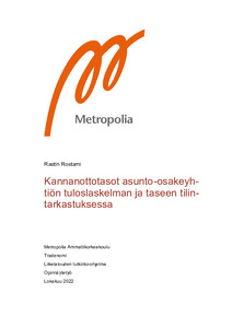 Tämän opinnäytetyön aiheena on kannanottotasot asunto-osakeyhtiön tuloslaskelman ja taseen tilintarkastuksessa. Työ tehtiin toimeksiantona yritykselle X, joka toimii tilintarkastusalalla. Toimeksiantajan tavoitteena oli saada selvitys siitä, toimiiko heidän työkirjansa oikealla tavalla automatisaation ja kannanottotasojen osalta sekä tulisiko siihen tehdä muutoksia. Henkilökohtainen tavoite oli vastata toimeksiantajan kysymyksiin sekä luoda näkemys siitä, miten kannanottotasoja tulisi käyttää asunto-osakeyhtiön tuloslaskelman ja taseen tilintarkastuksessa.
