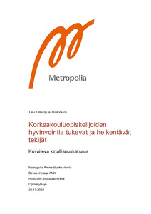 Opinnäytetyön aiheena on korkeakouluopiskelijoiden hyvinvointia tukevat ja heikentävät tekijät. Hyvinvoinnin käsite on moniulotteinen ja opinnäytetyön tehtävänä on ollut selvittää, mitkä tekivät vaikuttavat opiskelijoiden fyysiseen, psyykkiseen ja sosiaaliseen hyvinvointiin. Opinnäytetyö toteutettiin kuvailevana kirjallisuuskatsauksena. Analysoitavia artikkeleita hakiessa on käytetty CINAHL- ja PubMed- tietokantoja sekä manuaalista hakua. Tutkimusaineistona käytettiin englanninkielisiä ja suomenkielisiä vertaisarvioituja artikkeleja. Analyysimenetelmänä on käytetty induktiivista sisällönanalyysimenetelmää.