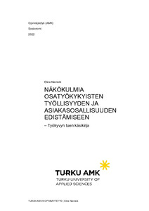 Käsikirja ja opinnäytetyöraportin tietoperusta on koottu ajankohtaisen kirjallisuuden ja lähdeaineiston pohjalta. Työssä on hyödynnetty monipuolisesti muun muassa näitä teemoja koskevaa lainsäädäntöä, artikkeleita, tutkimuksia sekä näiden lisäksi ministeriöiden ja asiantuntijatahojen julkaisuja sekä suosituksia. The purpose of the development work related to this thesis report was to implement the Handbook of Work Ability Support in cooperation with multidisciplinary team. The commission for this development work came from the Friends are not left behind project which is implemented in the region of South-West Finland. The project is part of the Prime Minister Marin’s Work Ability Programme. A central goal of both the Work Ability Programme and the Friends are not left behind project is to promote employment opportunities for people with partial work ability. Background to the need for a handbook also lies in significant structural reforms, and the handbook is therefore intended to serve as a guide for employees with regards to work ability support services in the midst of major changes.