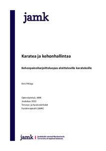 Karate on yksi maailman suosituimmista kamppailulajeista, jolla on maailmanlaajuisesti useita kymmeniä erilaisia tyylisuuntia. Karateharrastajat tulevat kaikista ikäluokista eikä harrastuksen aloittaminen vaadi aikaisempaa harrastetaustaa. Opinnäytetyö syntyi Jigotai Karate ry:n tarpeesta parantaa aloittelevien karatekoiden kehonhallintaa ja tasoittaa tätä kautta vasta-alkajien kuntotasoa. Työ toteutettiin tutkimuksellisena kehittämistyönä ja sen lopputuotoksena syntyi seuran harrastajien käyttöön tarkoitettu opas, joka tähtää aloittelevien harrastajien kehonhallinnan parantamiseen kehonpainoharjoittelun avulla. Karaten vaikutuksia kehonhallintaan on tutkittu verrattain paljon, mutta aivan selvää konsensusta parhaasta oheisharjoittelusta karatekan kehonhallinnan parantamiseksi ei ole. Työssä avattiin siis yleisesti kehonhallinnan teoriaa ja keinoja siihen vaikuttamiseen, sekä kehonpainoharjoittelun teoreettisen tietopohjan. Opas tuotettiin näitä yhdistelemällä lajinäkökulma silmällä pitäen. Työtä varten tutustuttiin myös hyvän oppaan kriteeristöön sekä saavutettavuuteen, jotta opas olisi kaikille saavutettava ja helppolukuinen. Opas tulee Jigotai Karate ry:n käyttöön ja sen käytöstä ei kerätä opinnäytetyötä varten palautetta, mutta tulevaisuutta ajatellen palautetta kerätään oppaan kehittämiseksi opinnäytetyön julkaisun jälkeen.