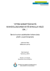 Seniorinuotan asiakkaiden kokemuksia yksilö- ja pariterapiasta : ”ETTEN MENETTÄIS NIITÄ MAHDOLLISUUKSIA MITÄ MINULLA VIELÄ ON…”