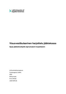 Opinnäytetyö toteutettiin toiminnallisena, konstruktivistisen mallin mukaan. Toimeksiantajana työlle toimi Lapin Liikuntaklinikka Oy. Opinnäytetyön tarkoituksena oli tuottaa videoharjoitteluopas jääkiekkoilijoille, missä keskitytään harjoittamaan sekä visuaalisia että vestibulaarisia taitoja ja ominaisuuksia. Tavoitteena oli lisätä tietoisuutta jääkiekkoilijoiden visuovestibulaarisesta harjoittelusta, ja näin myös tukea suomalaista jääkiekkovalmennusta. Harjoitteissa lähtökohtana oli lajinomaisuuden tukeminen, minkä vuoksi harjoitteet ovat jaettu sekä tasamaalla että jäällä suoritettavaksi. Harjoitteita on yhteensä kuusi. Videoharjoiteopas lisättiin Youtube-palveluun, josta se on saatavissa rajatusti linkin kautta Ice hockey is a versatile sport that requires a lot of different features and skills from the athlete. Over the years ice hockey has become more fast-paced sport which means that also the athlete needs to be able to meet the demands of the sport. Visual and vestibular skills are important features that support performance in the sport especially in ice hockey. Also, these two features support each other and training those features improves the athletes on-field performance. When training them together we can talk about visual-vestibular training. The subject itself is new in Finland so it was difficult to find other material about it. That is the reason why the thesis is necessary.