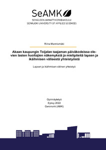 Tämän geronomi (AMK) -tutkinto-ohjelmaan kuuluvan opinnäytetyön aiheena on lapsen ja ikäihmisen välinen yhteistyö. Kohdeorganisaationa toimi Akaan kaupungin varhaiskasvatus. Tämän opinnäytetyön tarkoituksena oli selvittää Akaan kaupungin Toijalan taajaman kolmessa päiväkodissa olevien lasten huoltajien näkemyksiä ja mielipiteitä lapsen ja ikäihmisen välisen yhteistyön merkityksestä sekä varhaiskasvatuksen roolista lapsen ja ikäihmisen yhteistyön mahdollistajana.