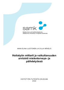 Tämän opinnäytetyön tarkoituksena oli kuvata hoitotyön mittareita ja vaikuttavuuden arviointia mielenterveys- ja päihdetyössä. Tavoitteena oli tuottaa tietoa mielenterveys- ja päihdetyön vaikuttavuudesta sekä löytää tilaajalle käyttökelpoinen mittari hoitotyön vaikuttavuuden arviointiin. Kirjallisuuskatsauksen avulla pyrimme vastaamaan kahteen tutkimuskysymykseen: Miten hoitotyön vaikuttavuutta arvioidaan? Millaisia mittareita on mielenterveys- ja päihdehoitotyön vaikuttavuuden arviointiin?
