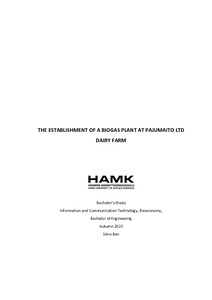 This thesis aimed to determine the conditions and profitability of setting up a farm-specific biogas plant for an Eastern Finnish dairy farm. The survey included the mapping of the possible feedstocks of the biogas plant, the review of the methane production potential of the feedstocks, and the selection of the plant technology of the biogas plant. The client of the thesis is Pajumaito Ltd dairy farm.