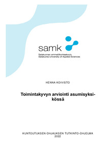 Opinnäytetyön tarkoituksena oli kehittää yhdessä asumisyksikön henkilökunnan kanssa yksikössä asuvien asukkaiden toimintakyvyn arviointikäytäntöä ja tavoitteena oli saada aikaan konkreettinen toimintakyvyn arviointimalli. Opinnäytetyössä haettiin vastausta tutkimusongelmaan: Minkälaiseksi asiakkaiden toimintakyvyn arviointiin liittyvä toimintatapa kohteena olevassa asumisyksikössä muodostuu?