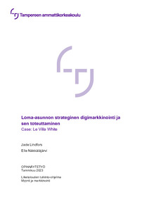 Tämän opinnäytetyön taustalla oli toimeksiantajan tarve käynnistää digimarkkinointi Levillä sijaitsevalle Le Villa White loma-asunnolle, jonka vuokraustoimintaa ollaan aloittamassa. Työn tavoitteena oli tarjota toimialaan sopivia työkaluja asiakaslähtöisen ja strategisen digimarkkinoinnin suunnitteluun sekä toteutukseen. Toimeksiantoa varten tarkoituksena oli selvittää asiakaskohderyhmä, mistä heidät tavoitetaan parhaiten, millä varausjärjestelmällä lomamökki varataan mieluiten, sekä mitkä asiat ovat tärkeimpiä loma-asunnon valitsemisessa. Verkkosivuista pyrittiin rakentamaan visuaalisesti miellyttävät, käyttäjäystävälliset ja informatiiviset.
