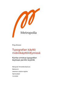 Opinnäytetyössä käsitellään typografian käyttöä mobiilikäyttöliittymissä 5,3–7 tuuman kokoisilla älypuhelimen näytöillä oikeaoppisesti ja silmää miellyttävästi. Tutkielman tavoitteena on selvittää kirjallisuutta ja muuta lähdemateriaalia apuna käyttäen, mitä tulee ottaa huomioon typografian käytössä, kun suunnitellaan pienille ruuduille, ja koostaa tietoa ohjenuoriksi, joiden avulla onnistua typografian käytössä.