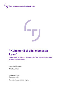 Opinnäytetyössä selvitettiin, millaisia kokemuksia seksuaali- ja sukupuolivähemmistöillä on saamastaan seksuaalikasvatuksesta. Opinnäytetyö sisältää katsauksen kirjallisuuteen seksuaali- ja sukupuolivähemmistöjen kokemuksia aiheesta kartoittaen. Opinnäytetyön yhteistyötahona toimi Tampereen koulu- ja opiskeluterveydenhuolto. Tavoitteena on kartoittaa seksuaali- ja sukupuolivähemmistöjen kokemuksia seksuaalikasvatuksesta, jotta seksuaalikasvatusta voitaisiin kehittää inklusiivisemmaksi.