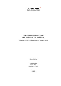 Toteutin opinnäytetyöni toiminnallisena opinnäytetyönä. Opinnäytetyöni tarkoituksena oli tuottaa tietoa varhaiskasvatuksen käyttöön lapsen luontosuhteen tukemisesta sekä lähiluonnon monipuolisesta hyödyntämisestä varhaiskasvatuksen toiminnassa. Opinnäytetyöni pohjautuu pitkälti valtakunnalliseen ja saamelaiseen varhaiskasvatussuunnitelmaan. Opinnäytetyöhöni kuuluu toiminnallinen osuus, jossa tein varhaiskasvatuksen käyttöön vuosikellon sekä toimintakortit, jotka pohjautuvat pohjoisen kahdeksaan vuodenaikaan ja johon on lisätty saamelaisen varhaiskasvatuksen arvot sekä valtakunnallisen varhaiskasvatuksen oppimisen alueet.