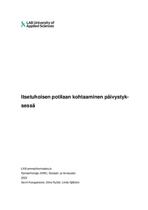 Opinnäytetyössä käsitellään itsetuhoisen potilaan kohtaamista päivystyksessä työskentelevien sairaanhoitajien näkökulmasta sekä kyseisen potilasryhmän tuomia haasteita ja niiden vaikutuksia työhyvinvointiin. Haluttiin myös selvittää päivystyksen valmiuksia itsetuhoisen potilaan kohtaamiseen ja hoitoon, sekä yhteistyön toimivuutta mielenterveyspalveluiden kanssa. Itsetuhoisuus aiheena on ajankohtainen ja tärkeä jatkuvasti lisääntyvien mielenterveyden ongelmien takia. Itsetuhoisuutta on myös Suomessa paljon ja itsemurhatilastot ovat korkeita. Suomessa ei ole juurikaan tutkittu itsetuhoisuutta hoitajien näkökulmasta.