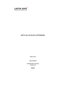 Opinnäytetyöni aiheena oli jatkuva oppiminen. Opinnäytetyössä keskityttiin teo-riaosuudessa siihen, mistä kaikesta jatkuva oppiminen koostuu, miten osaamista johdetaan ja mitä on työpaikoilla esiintyvä hiljainen tieto. Tutkimuskysymyksinä olivat mitä on jatkuva oppiminen, miksi jatkuva oppiminen on tärkeää sekä mitkä ovat oppimisen tavoitteita.