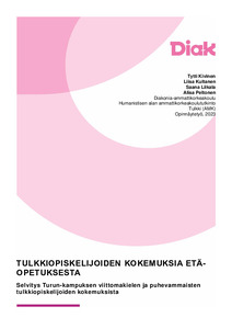Opinnäytetyö tehtiin yhteistyössä Diakonia-ammattikorkeakoulun hallinnoiman Tulevaisuuden tulkkaustaidot –hankkeen kanssa. Opinnäytetyön tarkoitus oli kartoittaa Diakonia-ammattikorkeakoulun viittomakielen ja puhevammaisten tulkkauksen opiskelijoiden kokemuksia etäopetuksesta. Webropol-kyselyn avulla kerättiin Turun-kampuksen opiskelijoiden kokemuksia ja näkökulmia etäopetuksen onnistumisesta. Kyselyn avulla tarkasteltiin etäopetuksen laatua, toimivia ratkaisuja sekä mahdollisia puutteita. Opinnäytetyön tavoitteena oli luoda kehitysideoita Tulevaisuuden tulkkaustaidot –hankkeelle Diakonia-ammattikorkeakoulun viittomakielen ja puhevammaisten tulkkauksen etäopetuksen kehittämiseksi.