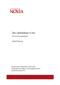 Den praktiska delen består av en serie svartvita målningar. Motiven är AI-genererade byster som bär medaljonger som för mig får sin mening genom datorspelet Terraria. I krypterad text i målningarna beskriver jag metaforiskt personliga, definierande minnen och upplevelser främst kopplade till virtuella miljöer och fiktiva historier i datorspel. Texterna innehåller bland annat bisarra historier, dikter och gåtor. I en värld med allt kraftigare AI blir det viktigare än någonsin att uppskatta och sätta värde på vår mänsklighet. In this project, I set out to explore things that shape an individual and make us who we are through personal introspection. I have worked based on the idea that it is not our achievements and results in themselves that we value, but rather all the experience and the lessons that have given us the conditions to perform.