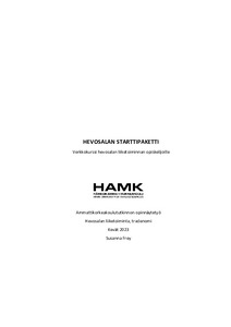 Opinnäytetyön tuotoksena syntyi kolmen opintopisteen laajuinen opintojakso, Hevosalan starttipaketti. Hevosalan starttipaketissa tarkasteltiin hevosalan toimintaympäristöä. Siinä tutustuttiin alan organisaatioihin, hevosalan toimijoihin sekä alan liike- ja harrastustoimintaan. Opintojaksossa käsiteltiin myös hevosen hyvinvointia ja lajityypillistä käyttäytymistä. Hevosalan starttipaketin tavoitteena oli vahvistaa hevosalan liiketoiminnan opiskelijoiden tietoja hevosesta ja suomalaisesta hevostaloudesta. The purpose of this thesis was to develop the equine business management education by creating an online course. Basic knowledge on the equine industry in Finland formed the course contents. The aim was to increase students’ knowledge of the business environment in the horse sector. The commissioner of the thesis was Häme University of Applied Sciences.