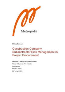 The thesis used qualitative research methods for data collection, such as semi-structured interviews and analysis of internal documents. The current state analysis of the case company´s subcontractor risk management in project procurement pointed to the strengths and weaknesses of the current process. Lack of risk management in subcontractor selection process has caused the company poor work quality and schedule problems with subcontractors chosen for projects. To a lesser extent, it also resulted in cost overruns, and risks to the case company's reputation due to the work performed by subcontractors. To tackle the identified challenges, the theoretical framework focused on the topics of risk management in procurement related to subcontractor evaluation and selection. The developed tool was tested and piloted according to the principles of action research.