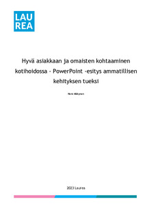 Opinnäytetyö tehtiin toiminnallisena opinnäytetyönä, jossa lopputuloksena syntyi konkreettinen tuotos, Powerpoint -esitys, pohjautuen aiempaan tutkittuun tietoon ja alan kirjallisuuteen. Tietoperustana opinnäytetyössä on käytetty luotettavia ja ajantasaisia lähteitä koskien kotihoitoa ja hyvää, ammatillista kohtaamista. Lisäksi Powerpoint -diat on toteutettu lähteisiin perustuen hyvän Powerpoint esityksen määritelmän mukaisesti. Sisältö koostettiin keskeisimmistä ja oleellisimmista asioista, kuten vuorovaikutusosaamisesta, sanallisesta ja sanattomasta kohtaamisesta, kuulluksi tulemisesta sekä omaisten kohtaamisesta. Powerpointista tehtiin helposti ymmärrettävä ja selkeä, jossa pääpaino on tekstissä. Opinnäytetyön lopputuotoksesta kerättiin palaute kohderyhmältä käyttäen palautelomaketta. Palaute oli positiivista ja kaikki vastanneista kokivat Powerpoint -esityksen selkeäksi ja johdonmukaiseksi. Suurin osa vastanneista koki saaneensa jonkin verran työkaluja jatkoon ja osa materiaalin tarpeelliseksi. Yksi vastanneista ei kokenut saaneensa uusia työkaluja työhönsä. Kaikki vastanneet kuitenkin kokivat Powerpointin sisällön hyvänä kertauksena. Johtopäätöksinä voidaan todeta se, että vaikka asiakkaan ja omaisten ammatillinen kohtaaminen on hoitajille tuttua, niin tututkin asiat on säännöllisesti hyvä palautella mieleen, jolloin mahdollistetaan ammatillisen kehityksen ylläpitäminen.