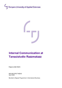 This bachelor thesis looked at how the internal communication is currently implemented at Tanssistudio Razzmatazz form the employee perspective. This thesis sought to identify the current level of internal communication within the organization and any potential issues. After the problem areas were located, potential fixes and development ideas were presented. The theoretical framework of this thesis focused on internal communication theories and channels. The research methodology, findings, conclusions, and recommendations for future are all covered in the empirical section.