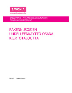 Opinnäytetyössä tutustuttiin rakentamisen kiertotalouteen ja lainsäädäntöön. Saatua tietoa sovellettiin jo olemassa olevaan kohteeseen, jonka eri rakenteille tarkasteltiin uudelleenkäytön mahdollisuuksia. Kohteen kantaville rakennusosille laskettiin hiilijalanjälki One Click LCA -ohjelmalla, ja saatua tulosta verrattiin siihen, jos rakennuksessa olisi hyödynnetty uudelleenkäytettyjä rakennusosia.