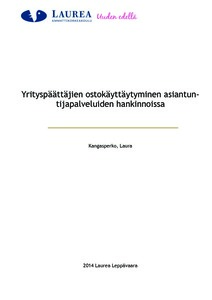 Tämän opinnäytetyön tarkoituksena oli selvittää suomalaisten yrityspäättäjien ostokäyttäytymistä asiantuntijapalveluiden hankinnoissa. Tavoitteena oli löytää vastauksia siihen, millainen on asiantuntijapalveluiden hankintaprosessi, miten he etsivät tietoa ostopäätösten tueksi sekä miten ja millä perusteella tapahtuu ostopäätöksen tekeminen ja lopullisen kumppanin valinta. Näiden vastauksien perusteella tavoitteena oli tuottaa kehitysehdotuksia toimeksiantajan myynnin ja markkinoinnin tueksi.