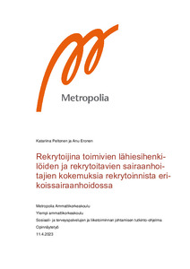 Tässä opinnäytetyössä tarkasteltiin lähiesihenkilöiden ja rekrytoitavien kokemuksia rekrytoinnista erikoissairaanhoidossa. Opinnäytetyö toteutettiin kyselylomakkeen sekä kirjallisuuskatsauksen avulla. Opinnäytetyön aineiston keruumenetelmänä käytettiin strukturoitua sähköistä kyselylomaketta. Kyselylomake toteutettiin Metropolian e-lomakkeella. Rekrytoijille lähetettiin kyselylomakkeet ja saatekirjeet sähköpostilla. Rekrytoivien osalta kerättiin aineisto kaikilta, jotka kävivät haastateltavina syys- ja lokakuun 2022 aikana. Työnhakijat saivat työhaastattelun yhteydessä suljetun kirjekuoren, jossa oli saatekirje sekä ohjeet sähköisen kyselyn täyttämiseen. Ylihoitajille laadittiin ohje, miten he jakavat suljetut kirjekuoret työnhakijoille haastatteluiden yhteydessä. Kysely toteutettiin HUS Akuutin sekä AteKin tulosyksiköissä. Vastauksia saatiin rekrytoijilta 12 ja rekrytoivilta 11. Kyselylomakkeiden suljetut kysymykset analysoitiin tilastollisia menetelmiä käyttäen SPSS-ohjelmalla. Tuloksista ilmeni, että rekrytointi on tärkeä asia sosiaali- ja terveysalalla.