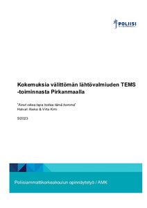 Opinnäytetyön tarkoituksena oli selvittää Sisä-Suomen poliisilaitoksen valvonta- ja hälytystehtävissä toimivien poliisien sekä Pirkanmaan pelastuslaitoksen TEMS-yksikössä työskentelevien ensihoitajien kokemuksia välittömän lähtövalmiuden TEMS-toiminnasta Pirkanmaalla. Opinnäytetyön tutkimustehtävinä oli selvittää minkälaisena poliisit ja ensihoitajat kokevat yhteistoiminnan, miten koettu hyöty ilmenee, mitkä ovat mahdolliset kehityskohteet, sekä mitä vaikutuksia toiminnalla on ollut henkilökohtaiseen osaamiseen. Opinnäytetyön tavoitteena oli tuottaa laadullista sekä luotettavaa tietoa kokemuksista välittömän lähtövalmiuden TEMS-toiminnasta.