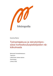 Tämän opinnäytetyön tavoitteena oli tutkia työnantajakuvaa ja rekrytointiprosessia korkeakouluopiskelijoiden näkökulmasta sekä löytää sellaisia tekijöitä, jotka vaikuttavat työnantajakuvaan ja kokemukseen rekrytointiprosessista. Kohderyhmänä toimivat eri alojen korkeakouluopiskelijat.