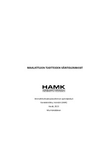Opinnäytetyön tilaaja on yhtiö, joka valmistaa tuotteita neljässä yksilöidyssä brändivärissä, tuotteiden loppukokoonpano tapahtuu Suomessa. Ennen kokoonpanoa tuotteen aliosat valmistetaan ja pintakäsitellään yhtiön oman tuotannon sekä toimittajien toimesta Suomessa ja ulkomailla. Yhtiössä on havaittu, että kappaleiden värisävyissä on eroja, vaikka jokaisen brändivärin pitäisi toistua samana kappaleesta riippumatta. Tässä työssä keskitytään värierojen analysointiin analyyttisella mittauslaitteella, spektrofotometrilla, minkä yhtiö on ostanut värin tarkastuksia varten vuonna 2021. Tämän työn tarkoituksena on syventää värimittauksien ymmärrystä tuloksien analysoinnissa sekä luoda toleranssit neljälle eri brändivärille laadunvarmistusta varten. Toimeksiantajan toiveesta tunnistetiedot on häivytetty, jonka takia työssä puhutaan yleisesti yhtiöstä.