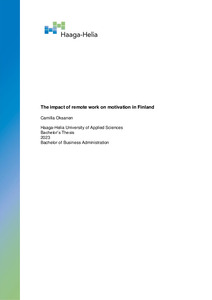 Kinsley, Sonia (2022)Due to a global pandemic that started in 2019, all companies needed to shift their work-space to remote working. The purpose of this thesis is to find out what kind of impact remote work has on employees’ motivation and ... -