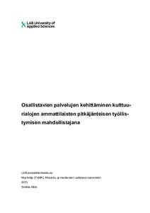 Laadullisen tutkimuksellisen kehittämistyön tavoitteena oli luoda liiketoimintamalli yritykselle, joka tarjoaisi osallistavia kulttuurihyvinvoinnin palveluja ja työllistäisi siten kulttuuritoimijoita mahdollisimman pitkäjänteisesti. Kehittämistyön lähestymistapa oli muotoiluajattelu, ja sen yhteissuunnittelussa käytettiin palvelumuotoilun menetelmiä. Työ painottui osallistavien kulttuuripalvelujen ideointiin, ja sen tuloksena syntyi useita palvelukokonaisuuksia. Kehittämisprosessi ajoittuu vuosiin 2020 – 2023. The goal of this qualitative design research was to create a business model that would provide participatory cultural activities and create long-term employment for professionals in arts, culture and media. The research approach of the design research was design thinking, and service design methods were used for ideating services at the co-design workshop. The design research focused on participatory cultural service ideation and resulted several service unities. This design research took place during the years 2020-2023.