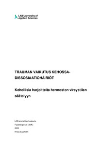 Tämä opinnäytetyö sisältää teoriaa vireystilan säätelystä ja kehollisista menetelmistä, dissosiaatiohäiriöistä sekä trauman vaikutuksista autonomisen hermoston toimintaan. Tarkoituksena oli tuottaa kehollisia harjoitteita hermoston yli- ja alivireystilojen vakauttamiseen ratkaisukeskeisen psykoterapian ammattilaiselle, joita hyödyntää käytännön työssä. Opinnäytetyö toteutettiin toiminnallisena opinnäytetyönä, jossa hyödynnettiin lineaarisen mallin kehystä ja tuotoksena syntyivät keholliset harjoitteet. Lineaarisen mallin mukaan työn vaiheet etenivät vaiheittain tavoitteen määrittelyyn, suunnitteluun ja toteutukseen, prosessin päätökseen sekä viimeiseksi arviointiin.