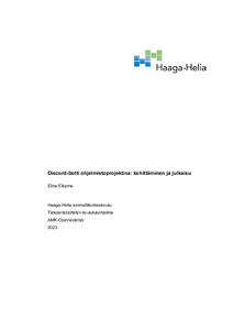Tietoperustassa käsitellään Discord-botteja tarkemmin, aiempia Discord-boteista tehtyjä opinnäytetöitä sekä ohjelmistokehityksen eri vaiheita. Botille tehtiin vaatimusmärittely ja toteutussuunnitelma. Sen jälkeen käsiteltiin botin rakennetta ja toteutusta. Botille kirjoitettiin testit. Botti hostattiin ja julkistettiin. Botin jatkokehitystä käytiin myös läpi ennen pohdintaa.
