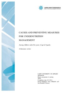 The study was conducted as descriptive literature review. The data was gathered from electrical data base via National Electronic Library Interface – information portal; Arto, Aleksi, Cinalh, Medic, Pubmed, Linda and EMBCO. Also sources such as Google Scholar books, publications, articles and various governmental internet pages were used to analyse and compare the results to meet the research questions. Keywords were malnutrition, undernutrition, causes, and children under 5 years, Uganda and prevention. The data was analysed by content analysis method.