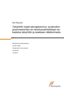 Vertailuun ja lähempään tarkasteluun valittiin neljä suurinta liikepankkia, joilla on tarjota useita erilaisia rahoitusinstrumentteja taloyhtiöille ja yksittäisille osakkaille. Pankkien tarjoamien tuotteiden nimet ja ehdot vaihtelevat paljon. Työssä selvitettiin eri rahoitusmallien eroja, tehtiin vertailuja, kerrottiin niiden hyvistä ja huonoista puolista yksittäisen osakkaan näkökulmasta. Työssä pohdittiin myös, miten lainarahoituksen hinta, kehitysodotukset ja saatavuus vaikuttavat tulevaisuudessa taloyhtiöiden isojen korjaushankkeiden toteuttamisessa.