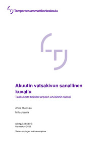 Tässä toiminnallisessa opinnäytetyössä selvitettiin yleisimpien akuuttia vatsakipua aiheuttavien sairauksien kuvailuun käytettäviä sanoja ja suunniteltiin taskukortti akuutti vatsa -potilaan hoidon tarpeen arvioinnin tueksi. Taskukorttiin koottiin sanoja, jotka kuvailevat kivun laatua, paikkaa, säteilyä, kestoa ja muuttumista. Taskukortti toimii tukena sekä hoitajalle hoidon tarpeen arvioinnin tekemiseen että potilaalle helpottamaan kipua kuvailevien sanojen valintaa. Taskukorttia voidaan käyttää myös opiskelumateriaalina.