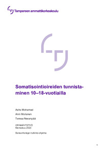 Tässä opinnäytetyössä selvitettiin 10–18-vuotiaiden lasten ja nuorten somatisointia, johon liittyy oireiden ja alttiuden tunnistaminen. Opinnäytetyön kysymyksinä olivat mitkä ja minkälaiset tekijät aiheuttavat somatisointioireita 10–18-vuotiailla nuorilla. Tavoitteena on lisätä tietoisuutta ja laajentaa ymmärrystä somatisaatio-oireilun eri esiintymismuodoista nuorilla ja niiden mekanismeista hoitohenkilöstölle sekä auttaa henkilökuntaa tunnistamaan erilaisia somatisaatiolle altistavia tekijöitä nuorilla.