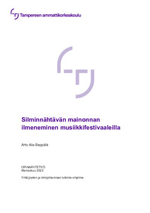 Opinnäytetyön tehtävänä oli tutkia, kuinka mainonta ilmenee silmin nähden musiikkifestivaaleilla. Tavoitteena oli kartoittaa kokonaiskuva mainonnankeinojen nykytilasta eri musiikkifestivaaleilla. Kenttätutkimuksen pohjalta laadittiin toimeksiantajalle kattava tietopaketti yritysyhteistöiden myyntikonseptin kehittämiseksi. Toimeksiantajana toimi itsenäinen manageri- ja ohjelmatoimisto Master Events.