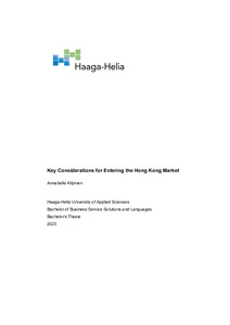 The objective of this thesis was to examine the key factors necessary for starting or expanding a business in Hong Kong. The key elements included studying the Hong Kong market and economy, exploring the city’s major industries, understanding the stages of the establishment process, and exploring different business structures. Additionally, cultural topics associated with business in Hong Kong played an important role in order for the reader to get a comprehensive and in-depth understanding of the business environment.