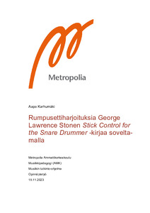 Opinnäytetyössäni tutkin, miten George Lawrence Stonen vuonna 1935 julkaisemaa Stick Control for the Snare Drummer -kirjaa voi soveltaa yhtenä rumpusettiopiskelijan harjoitustyökaluna. Esittelen kirjan historiaa ja siihen liittyvän soveltamiskäytännön syntyvaiheita. Selvitän kirjan roolia osana itseohjautuvaa sisäisesti motivoitunutta soittoharjoittelua.