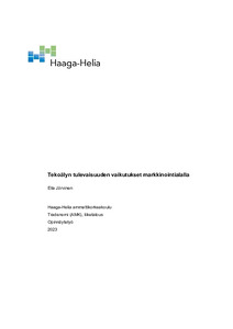 Tämän opinnäytetyön aihe oli tekoälyn tulevaisuuden vaikutukset markkinointialalla. Tutkimuksen tavoitteena oli selvittää, miten markkinointialalla työskentelevät näkevät tulevaisuudessa tekoälyn vaikutukset markkinoinnissa. Lisäksi selvitettiin, mitä markkinointialalla työskentelevät tietävät tekoälystä, mitä mahdollisuuksia tekoäly tuo markkinointialalle, mitä riskejä tekoäly tuo markkinointialalle sekä mitä markkinointialalla työskentelevät haluaisivat muuttaa tekoälyn käytöstä markkinoinnissa.