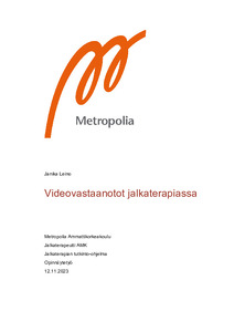 Tämän opinnäytetyön tarkoituksena on selvittää etävastaanottojen pitämisessä huomioitavia asioita jalkaterapeuttien näkökulmasta ja tuottaa tietoa siitä, mitä etävastaanottoja pitävien tai niiden järjestämistä suunnittelevien jalkaterapeuttien tulisi ottaa huomioon etävastaanottoja toteuttaessaan ja suunnitellessaan. Opinnäytetyössä keskitytään käsittelemään etävastaanottojen videovälitteistä muotoa (videovastaanottoja), joita toteutetaan reaaliaikaisena. Työn tavoitteena on siis vahvistaa jalkaterapeuttien valmiuksia etävastaanottojen pitämiseen. Opinnäytetyö on tehty yhteistyössä Metropolia Ammattikorkeakoulun jalkaterapian tutkinto-ohjelman kanssa.