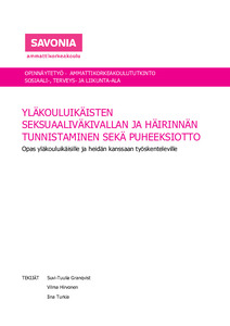 Kehittämistyön tuotoksena kirjallisen raportin lisäksi valmistui seksuaaliväkivallan ja häirinnän tunnistamisen sekä puheeksi ottamisen opas, jota voidaan hyödyntää yläkouluikäisiä nuoria kohdatessa. Opas suunniteltiin ja toteutettiin näyttöön perustuvan, mahdollisimman ajankohtaisen tiedon pohjalta. Oppaassa kerrottiin seksuaaliväkivaltaan ja häirintään liittyvistä käsitteistä, sekä asian puheeksi ottamisesta ja tunnistamisesta. Oppaassa käytiin myös läpi seksuaaliväkivallan ja häirinnän eri muotoja sekä miten apua voi hakea. Oppaasta tehtiin sähköinen pdf-versio, jonka tarvittaessa pystyy tulostamaan. Opas suunniteltiin yläkouluikäisiä nuoria ajatellen, ulkoasu ja oppaan sisältö pyrittiin tekemään mahdollisimman selkeäksi ja mielenkiintoiseksi. Adolescents’ experiences of sexual violence and harassment have increased over the years. The experiences of girls in particular have increased considerably. Sexual violence often causes shame and guilt and because of this seeking help might be difficult. This is why it would be important for professionals to have enough information on the subject and to know how to communicate with teenagers. It would also be important for teenagers to have sufficient information on the subject and how to find help.