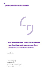 Opinnäytetyössä tarkasteltiin erään suuntaavan elektrostaattisen paneelikaiutinmallin valmistusprosessia tuotannollistamisvaiheessa. Työn tavoitteena oli parantaa tuotteen valmistettavuutta etsien ratkaisua kysymyksiin, voiko valmistusta nopeuttaa ja helpottaa sekä voiko valmistusmateriaaleja vaihtaa kustannustehokkaampiin tuotteen ominaisuuksien kärsimättä. Työn tilaaja on pieni toimija ja tuotantomäärät suhteellisen pieniä. Ratkaisu tuli mitoittaa realistisesti yhtiön vallitseviin resursseihin nähden. Työn lopputuloksena syntyi ehdotus kustannustehokkaammasta valmistusprosessista, jossa hyödynnetään yksinkertaisia tuotantolaitteita ja materiaaleja.