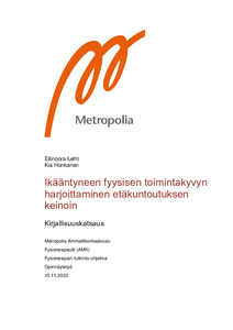 Opinnäytetyö on kirjallisuuskatsaus, jossa tarkastellaan ikääntyneiden fyysisen toimintakyvyn harjoittamista etäkuntoutusmenetelmien avulla. Kirjallisuuskatsaukseen valikoitujen tutkimusten teemana on ikääntyneiden etäkuntoutus etäteknologiaa käyttäen, minkä avulla pyritään lisäämään ihmisen fyysistä toimintakykyä ja/tai elämänlaatua. Katsauksen tutkimusten tietokannoiksi valikoitui PubMed ja CINAHL. Tutkimuksia valikoitui 10 ja ne olivat tieteelliseen tietokantaan julkaistuja satunnaistettuja kontrolloituja tutkimuksia, systemaattisia meta-analyyseja tai systemaattisia katsauksia. Kirjallisuuskatsauksen avulla pyritään selvittämään etäkuntoutuksen keinoja ikääntyneiden fyysiseen toimintakykyyn, mitä voidaan soveltaa suunnitellessa ja toteutettaessa ikääntyneiden fysioterapiaa. Katsauksen tavoitteena on kertoa etäkuntoutuksen käyttömahdollisuuksista ja niiden hyödyntämisestä fysioterapiassa.