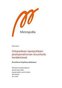 Tämän opinnäytetyön tarkoituksena on kuvata kouluikäisten noin 7–12-vuotiaiden ortopedisten lapsipotilaiden postoperatiivista kivunhoitoa heräämössä kuvailevan kirjallisuuskatsauksen avulla. Keskityimme tässä opinnäytetyössä lääkkeelliseen että lääkkeettömään kivunhoitoon heräämössä. Opinnäytetyön tavoitteena on tuottaa tietoa ortopedisten lapsipotilaiden postoperatiivisesta kivunhoidosta heräämöhoidossa, sillä lasten kivunhoito jää nihkeämmäksi kuin aikuisten kivunhoito.