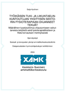 Kehitysehdotuksena esitetään, että yksityisen sektorin tule-fysioterapiaan ohjauduttaisiin suoraan varaamalla aika itse, tai terveydenhuollon ammattilaisen hoidontarpeen arvioinnin kautta. Lääkärin vastaanotolle ohjautuville työikäisille tule-kuntoutujille tulisi tarjota fysioterapialähete, mikä edistää fysioterapiaan ohjautumista. Kela-korvauksen palauttaminen yksityisen sektorin fysioterapiaan, sekä fysioterapian, siihen liittyvien palveluiden ja fysioterapeuttien ammatillisen osaamisen markkinointi, tukisi ohjautumista fysioterapiaan. Tutkimuksesta saatujen tulosten myötä pystytään kehittämään työikäisten tule-kuntoutujien fysioterapiaan ohjautumiseen vaikuttavia tekijöitä. As a result of the amendment to the Health Insurance Act, Social Insurance Institution of Finland (KELA) has not reimbursed the costs of private physiotherapy treatment based on a doctor's referral since 1 January 2023. The purpose of the thesis was to describe the factors that led a working-age person with musculoskeletal disorders (MSDs) to seek physiotherapy in the private sector, and to find out what role the physiotherapy referral and Kela reimbursement played in the referral to physiotherapy.