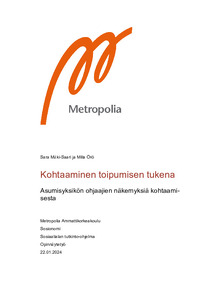Asukkaiden ja ohjaajien välinen vuorovaikutussuhde on tärkeä osa mielenterveyskuntoutujien toipumisprosessia. Opinnäytetyön tuottaa tietoa siitä, miten hyvällä kohtaamisella voidaan tukea mielenterveyskuntoutujien toipumista asumisyksikön ohjaajien näkökulmasta. Tavoitteena oli tuoda esiin työntekijöiden näkemyksiä ja kokemuksia asiakkaiden kohtaamisesta ja auttaa opinnäytetyön yhteistyökumppania kehittämään toimintaansa. Opinnäytetyön yhteistyökumppani on yksityisen sektorin mielenterveyskuntoutujien asumisyksikkö pääkaupunkiseudulla. Idea opinnäytetyön aiheeseen muodostui toisen opinnäytetyöntekijän ollessa työsuhteessa yhteistyökumppanilla.