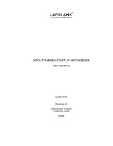 Opinnäytetyössä käsiteltiin sitouttamista startup-yrityksessä ja toimeksiantajana toimii Quanturi Oy. Tutkimuksen tarkoituksena oli selvittää kuinka sitouttaa työntekijöitä startup-yritykseen, jossa budjetti on rajattu. Lisäksi selvitettiin myös, kuinka johtaminen vaikuttaa sitouttamiseen. Tutkimuksen avulla Quanturi Oy voi sitouttaa työntekijöitään entistä paremmin, jotta työntekijät pysyisivät yrityksessä, mutta myös työskentelevät tehokkaasti yrityksen tavoitteiden mukaan.