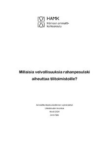 Opinnäytetyön aiheena oli, millaisia velvollisuuksia rahanpesulaki aiheuttaa tilitoimistoille. Työn tavoitteena oli selvittää, millaisia vaikutuksia rahanpesulailla on tilitoimistojen toimintaan, miten tilitoimistoissa koetaan rahanpesulain asettamat vaatimukset sekä miten velvoitteiden noudattaminen vaihtelee erikokoisissa tilitoimistoissa.